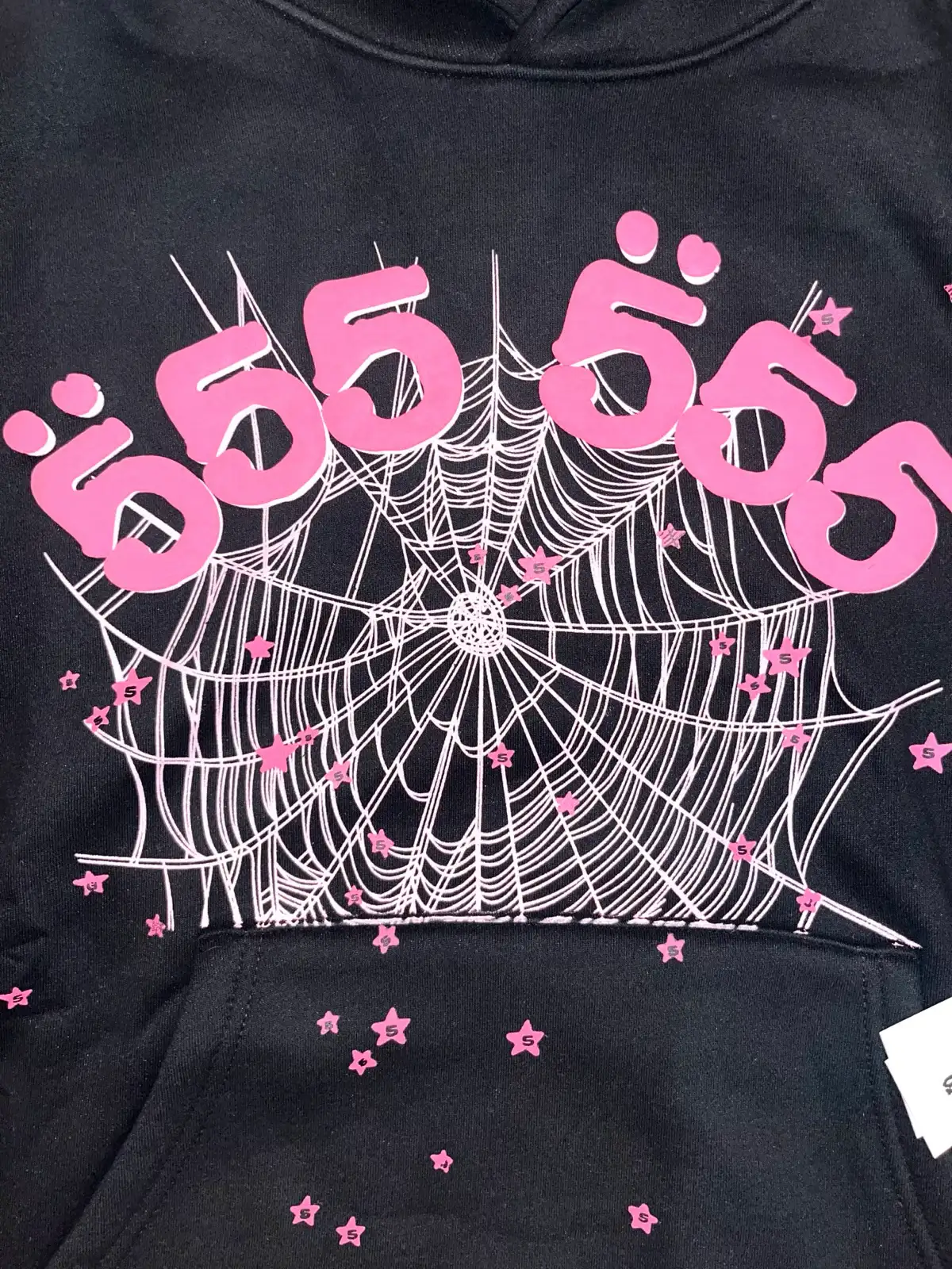 This distinctively eye-catching hoodie showcases a dazzling spider web logo adorned with a prominent “555 555” graphic thoughtfully layered atop it. The sweatshirt’s hood also boldly displays the Sp5der logo, adding to its striking and bold design.