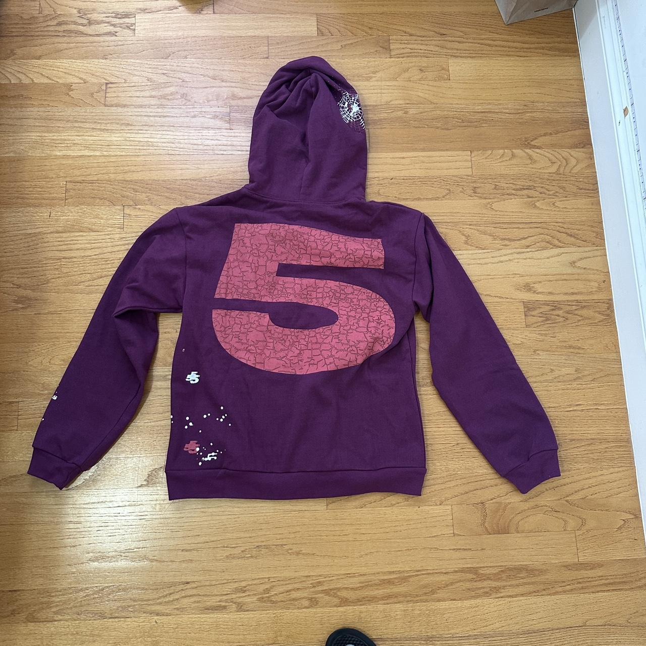 This distinctively eye-catching hoodie showcases a dazzling spider web logo adorned with a prominent “555 555” graphic thoughtfully layered atop it. The sweatshirt’s hood also boldly displays the Sp5der logo, adding to its striking and bold design.