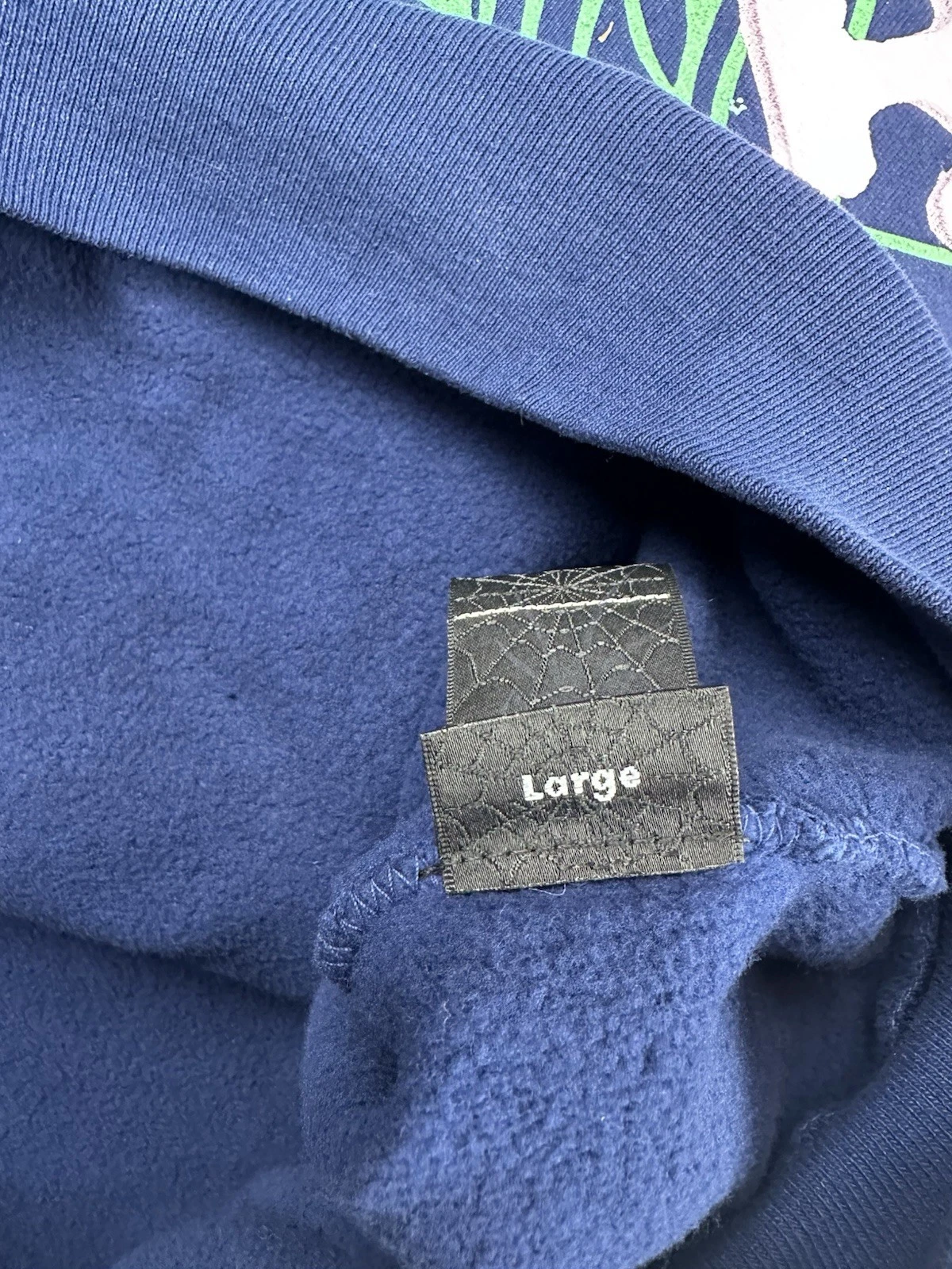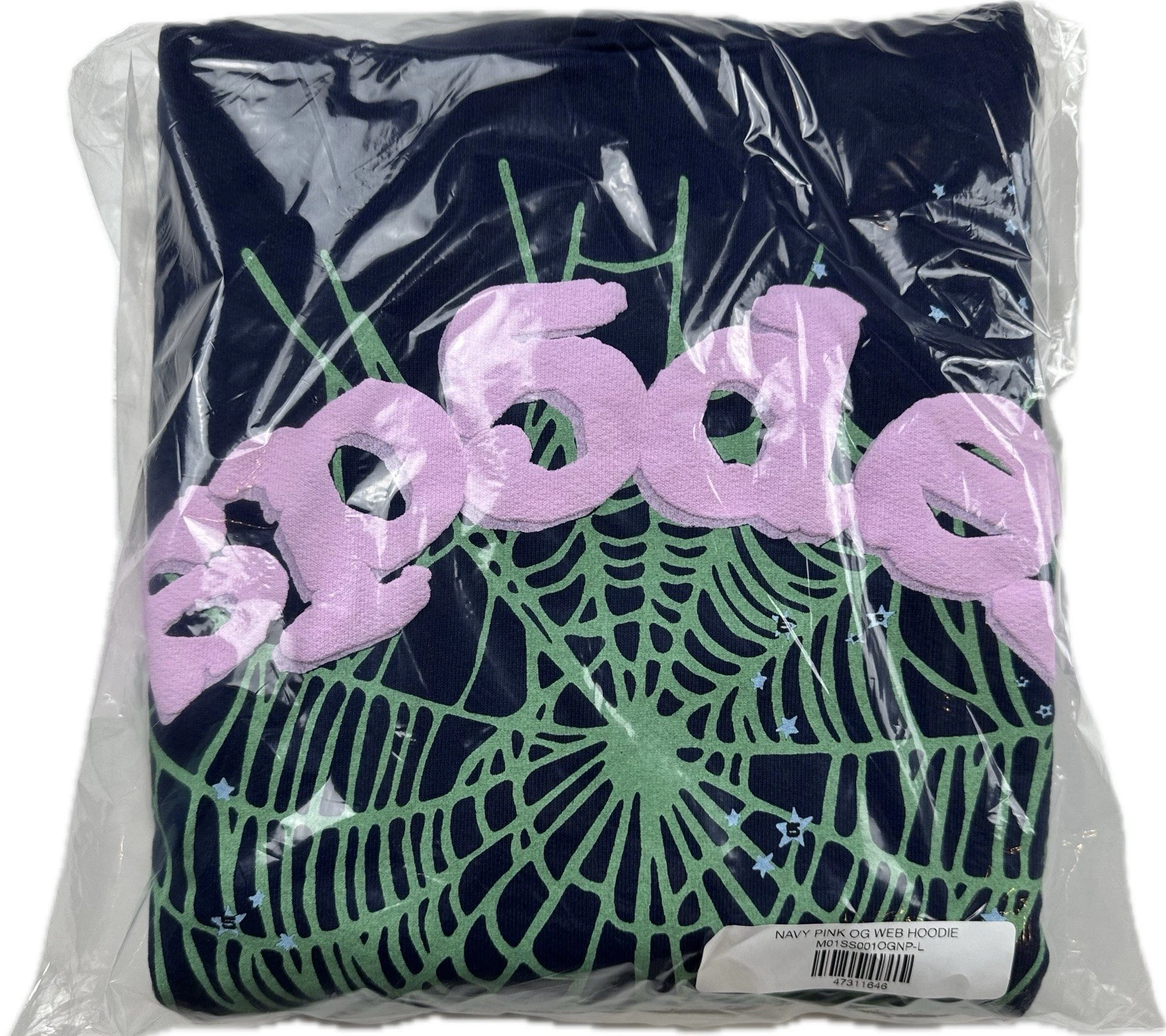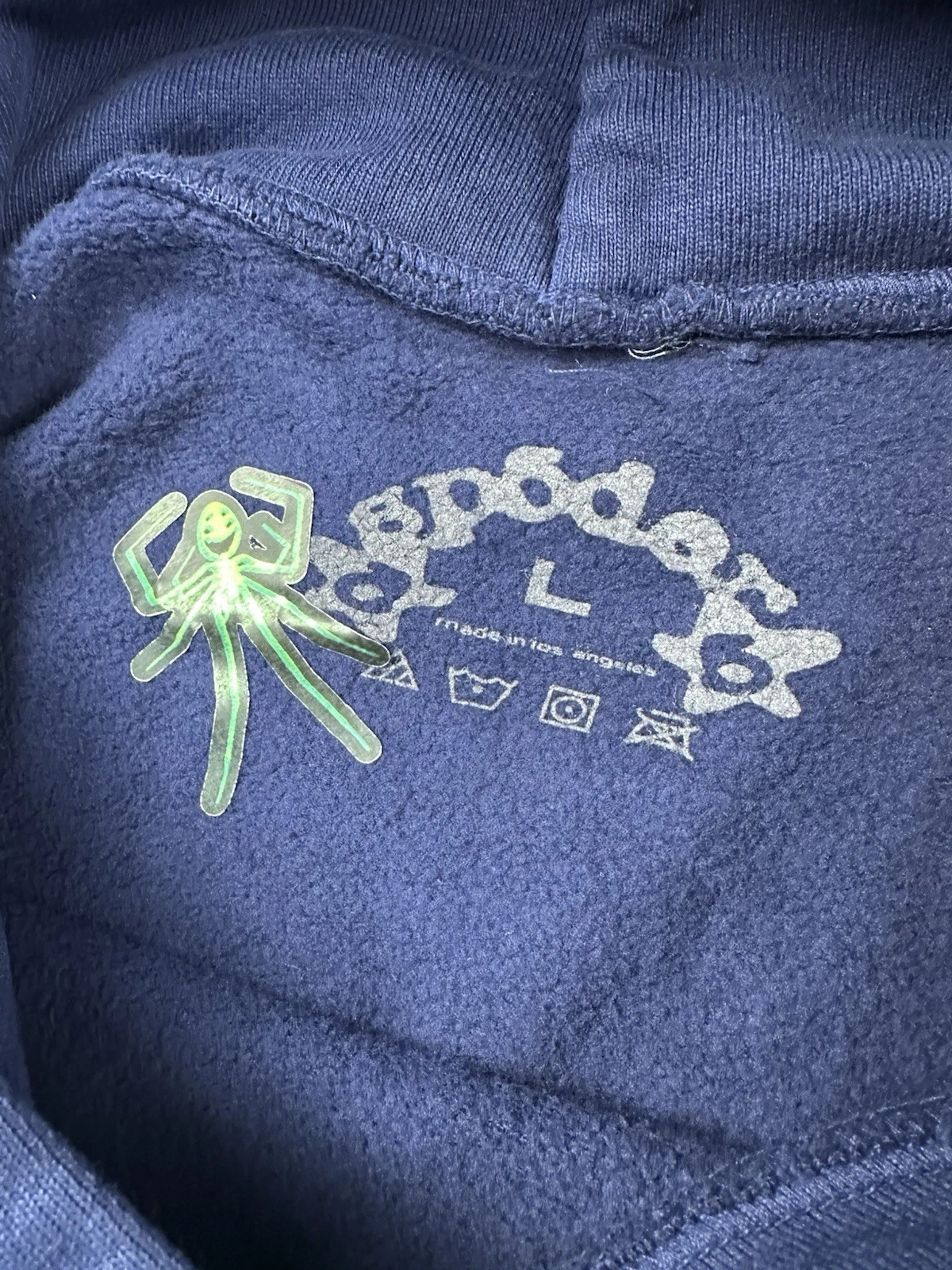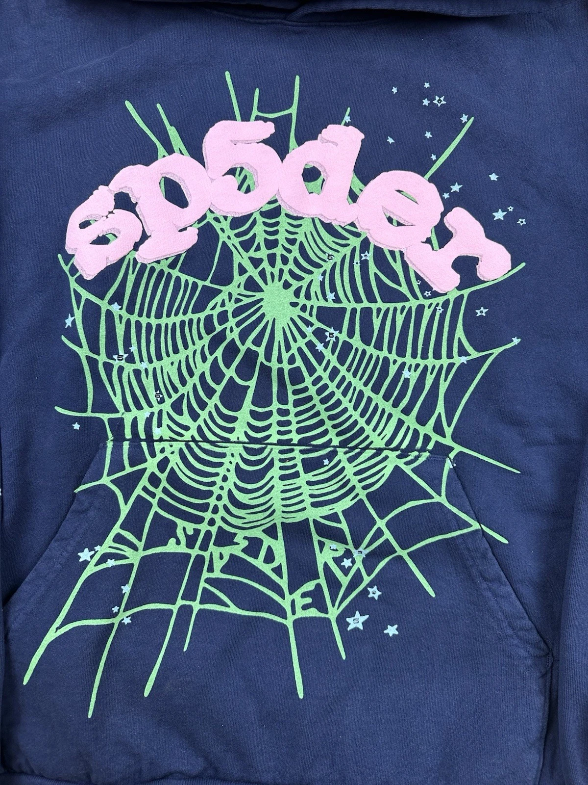 This distinctively eye-catching hoodie showcases a dazzling spider web logo adorned with a prominent “555 555” graphic thoughtfully layered atop it. The sweatshirt’s hood also boldly displays the Sp5der logo, adding to its striking and bold design.