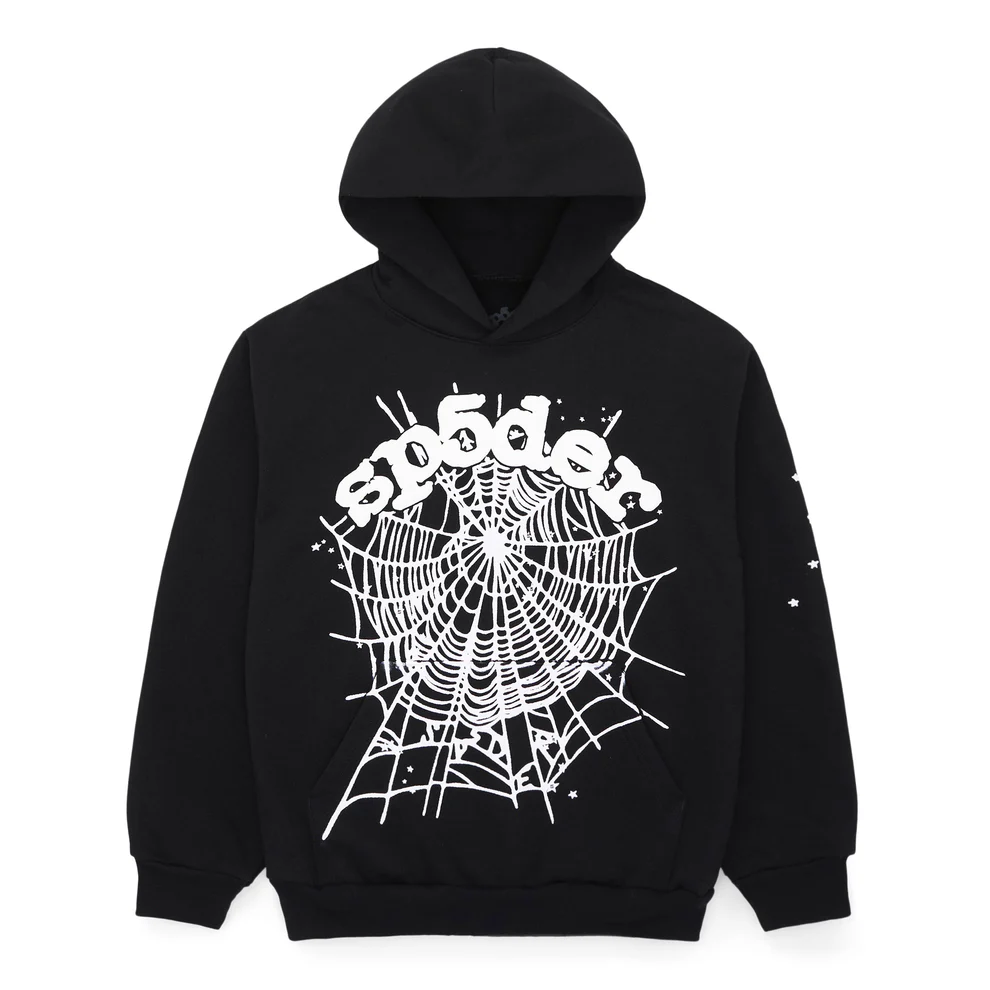 This hoodie features bold white Sp5der branding across the chest and is further enhanced by an intricate white spider web motif with delicate white stars throughout the front.