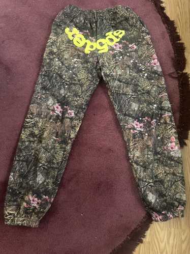 This version of the Sp5der Real Tree OG Web Sweatpants comes in a camouflage print throughout. The color is largely different shades of brown as the pattern features tree branches and needles and what looks like yellow-brown grass in the background. Some of the tree branches have also sprouted pink flowers. The only deviation from this camouflage pattern is the Sp5der brand name, which appears in an inverted arch under the front waistband in light yellow text. The sweatpants also feature closed elastic bottoms around the ankles.