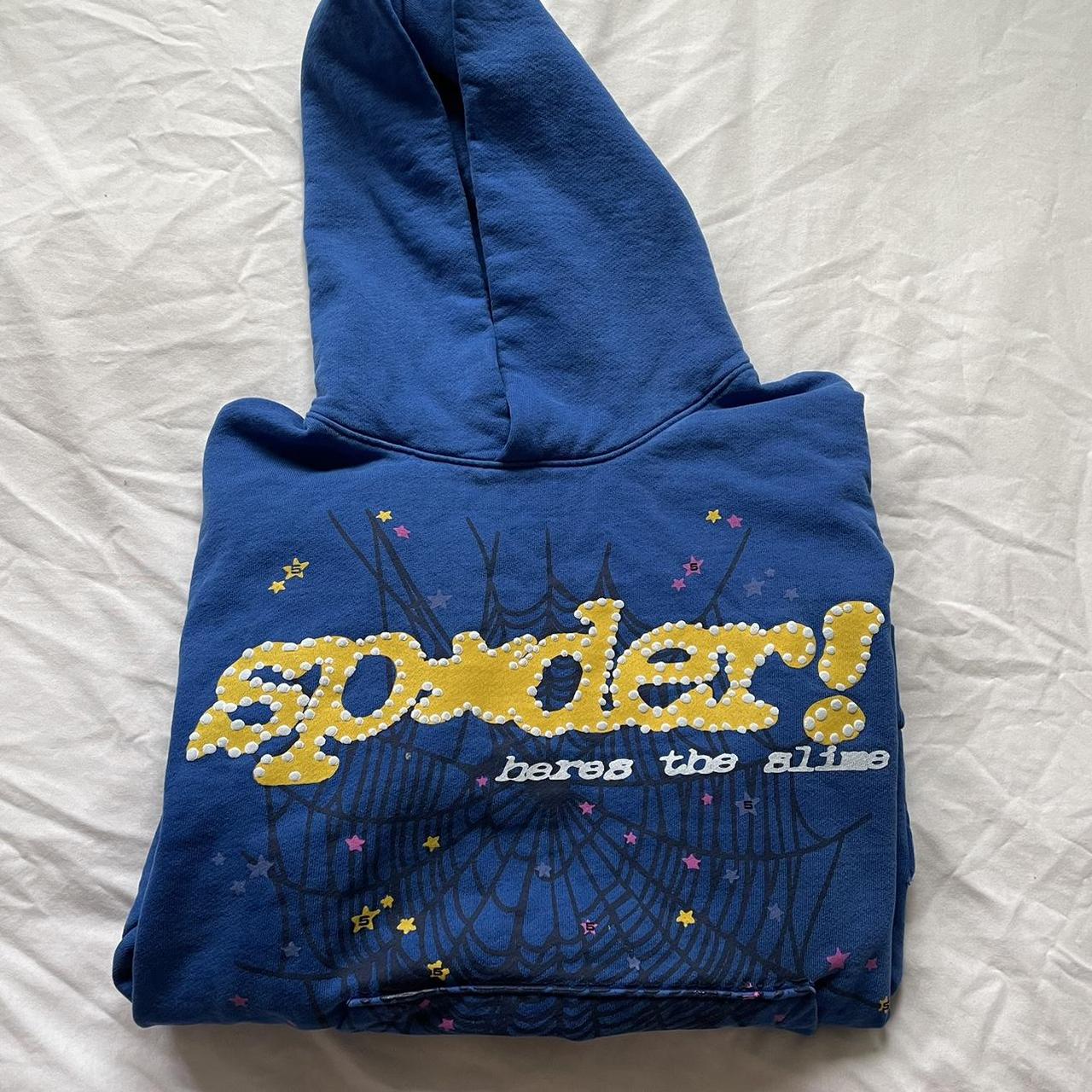 This distinctively eye-catching hoodie showcases a dazzling spider web logo adorned with a prominent “555 555” graphic thoughtfully layered atop it. The sweatshirt’s hood also boldly displays the Sp5der logo, adding to its striking and bold design.